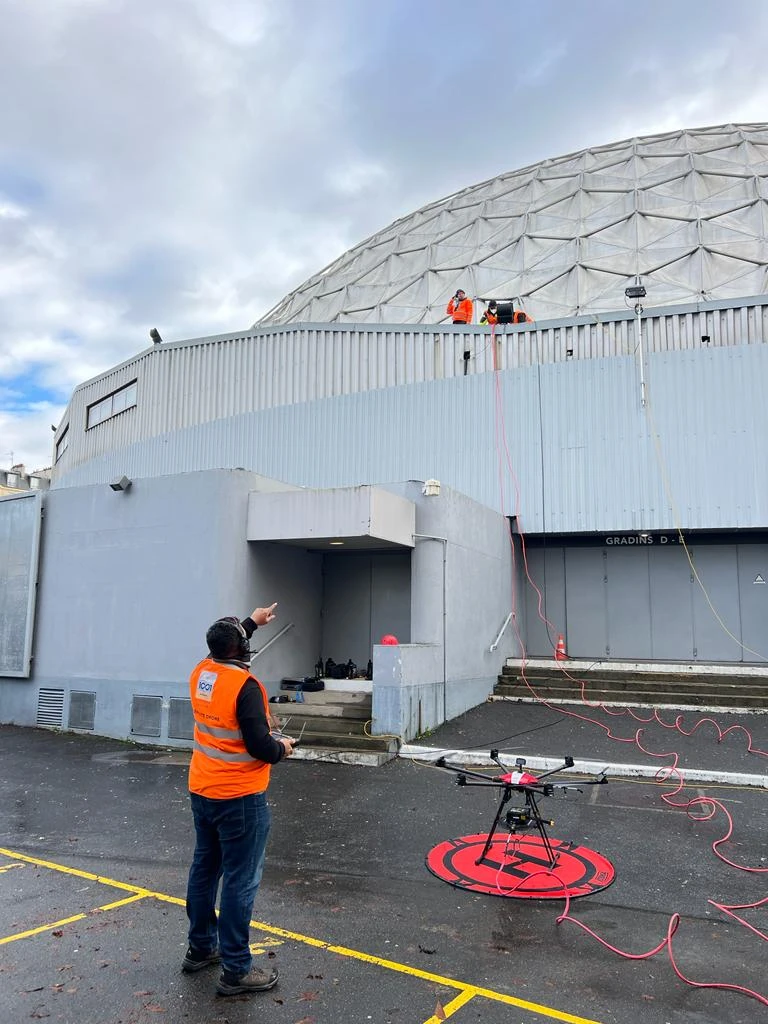 Pour cette intervention, W-Drones a mobilisé une équipe d’opérateurs certifiés, spécialisés dans la manipulation de drones professionnels. Le dôme à nettoyer présentait une hauteur de plus de 30 mètres et une surface en zinc particulièrement encrassée par la pollution urbaine.
